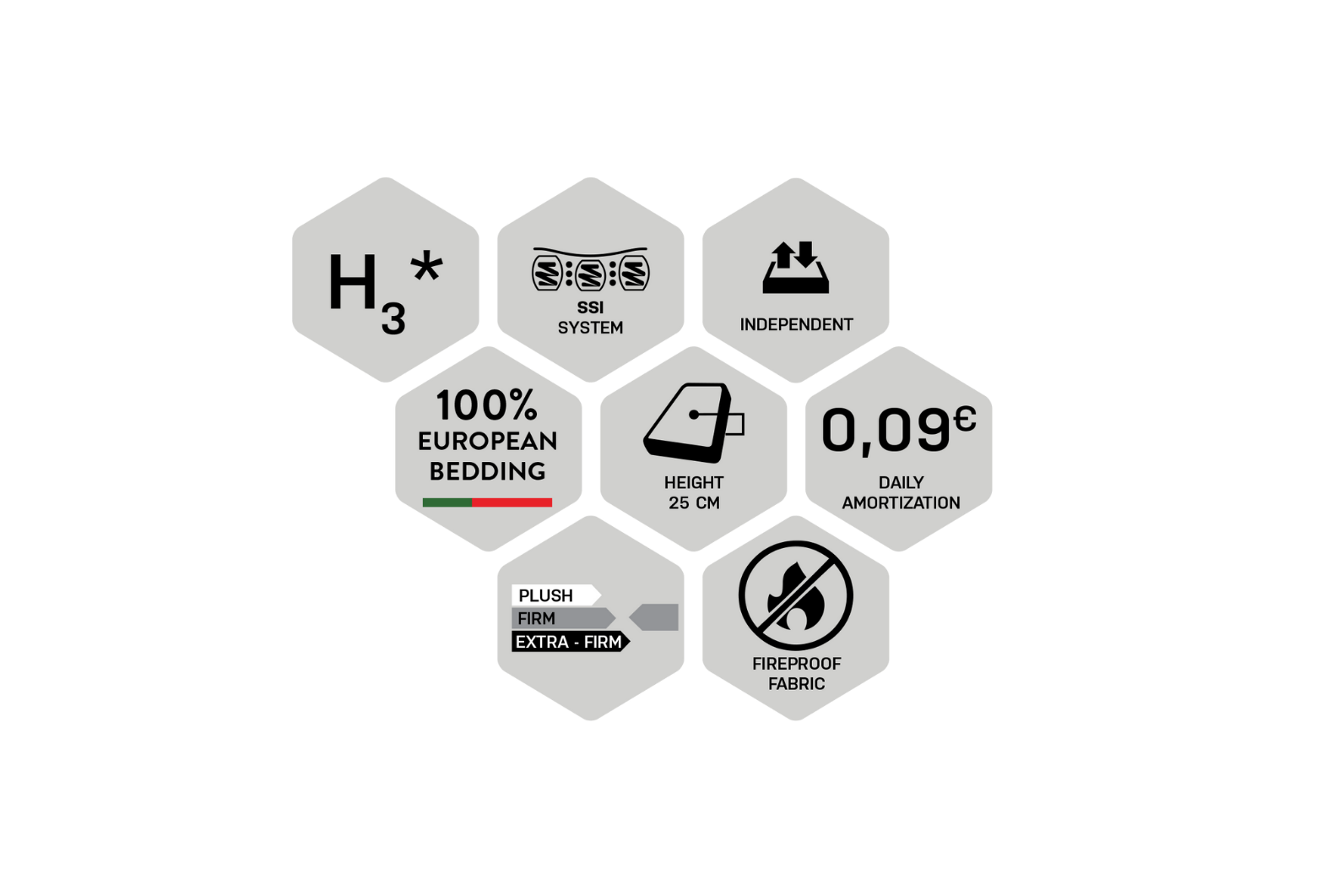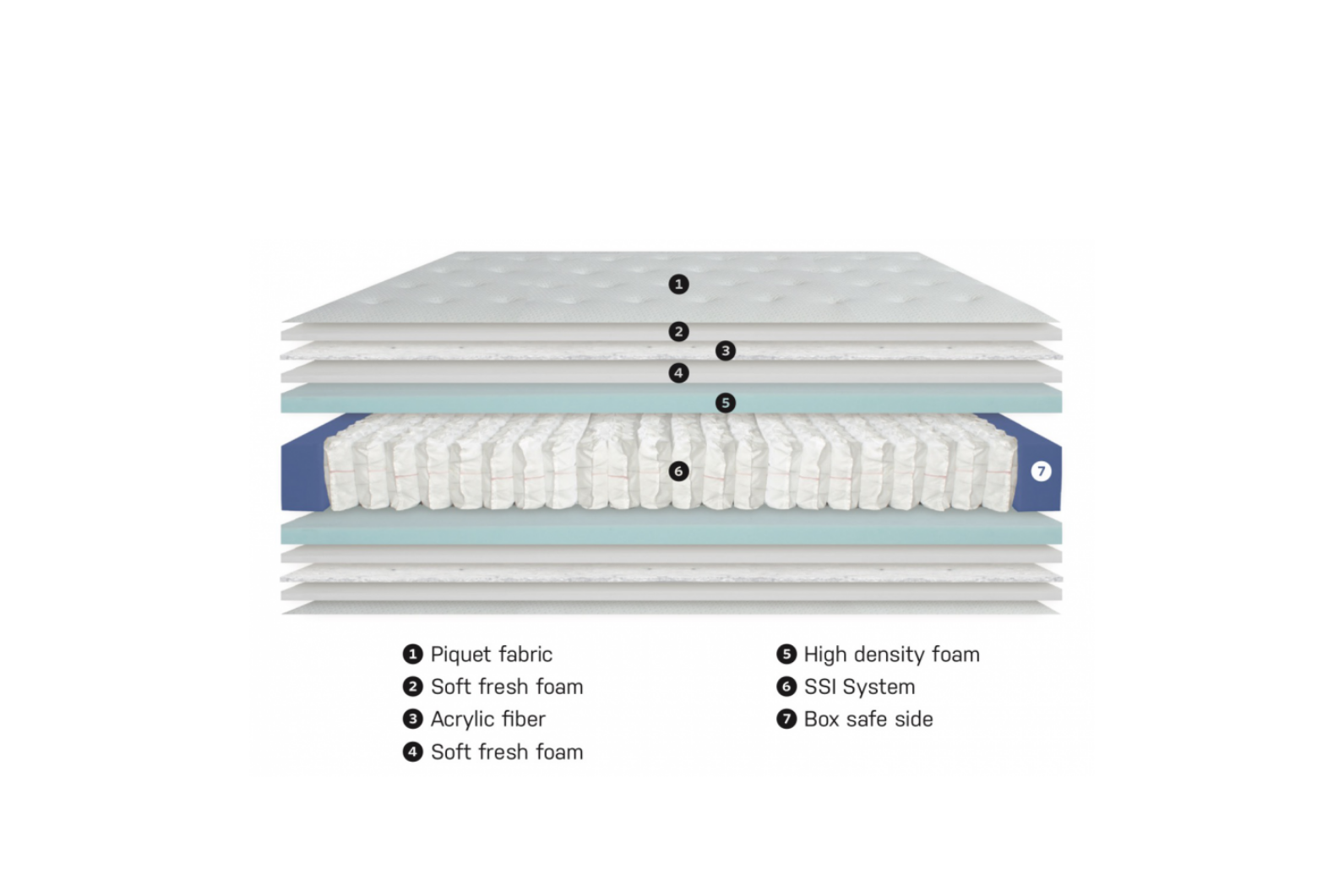 Sistema SSI, de molas ensacadas, de suspensão ponto por ponto. Totalmente independente. Permite a ventilação interna. Espumas adaptáveis e resistentes. Grau médio de conforto. Firmeza intermediária (estrutura). Sistema de Caixa de Segurança, que garante que toda a área de superfície seja útil.