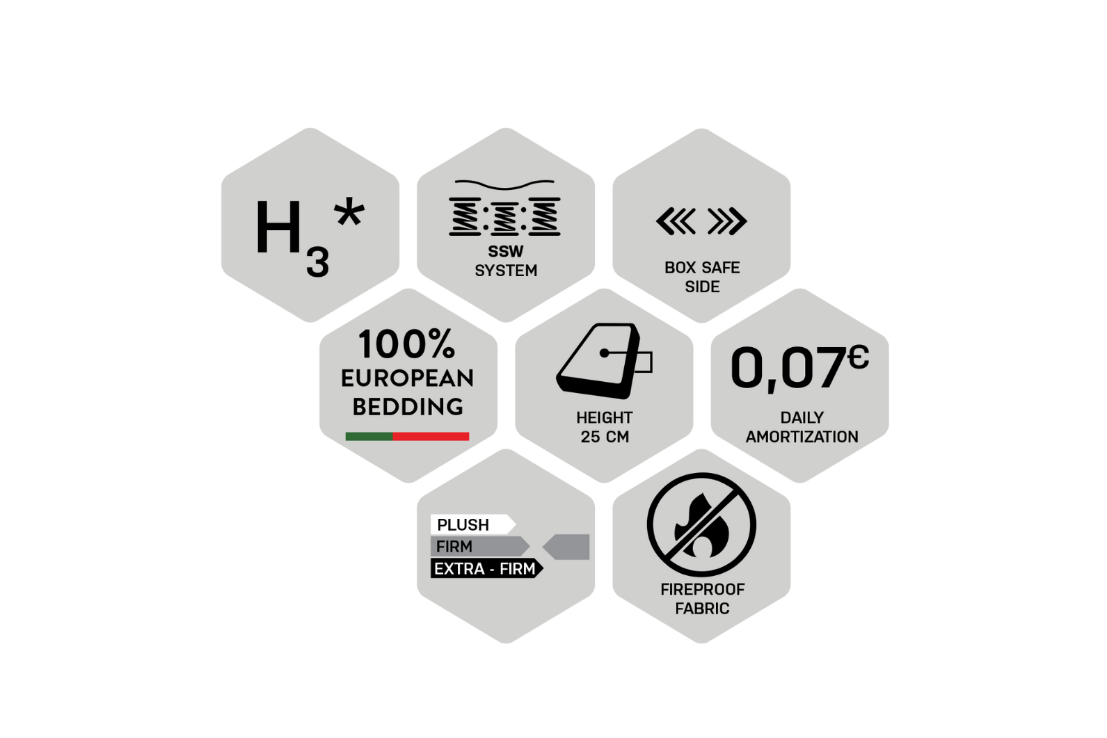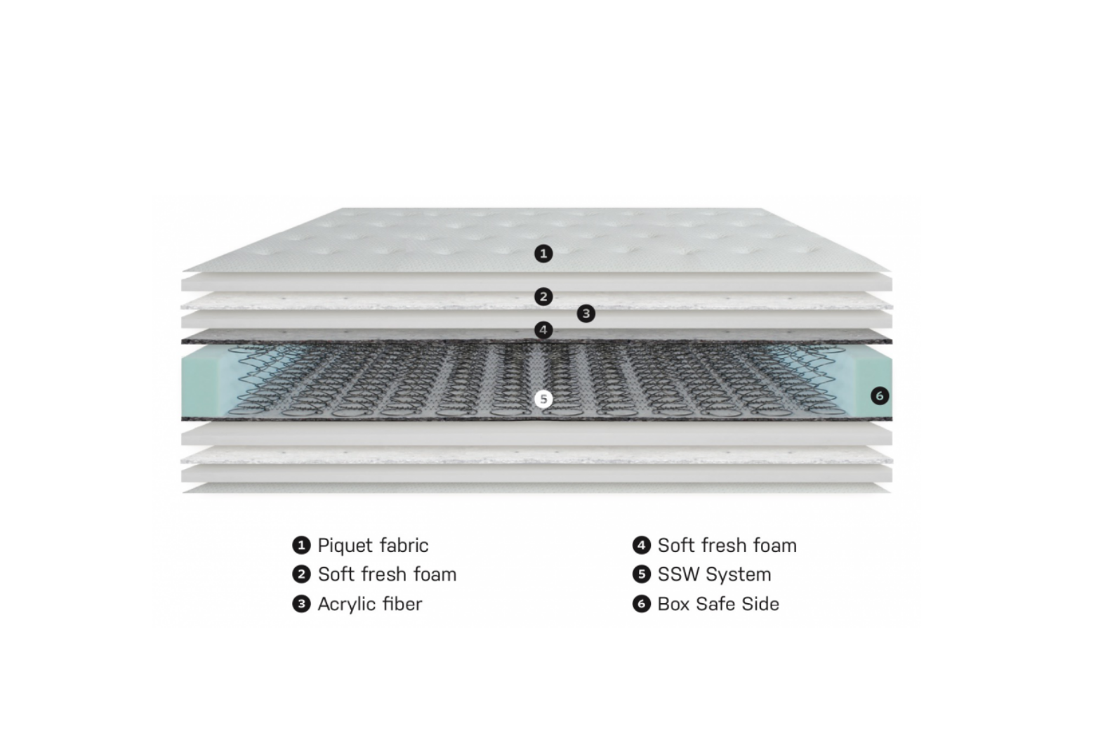 Sistema de suspensão que garante o melhor suporte e permite ventilação interna. Espumas adaptáveis e resistentes. Grau médio de conforto. Alta firmeza (estrutura). Sistema de Caixa de Segurança, garante que toda a área da superfície esteja bem suportada.