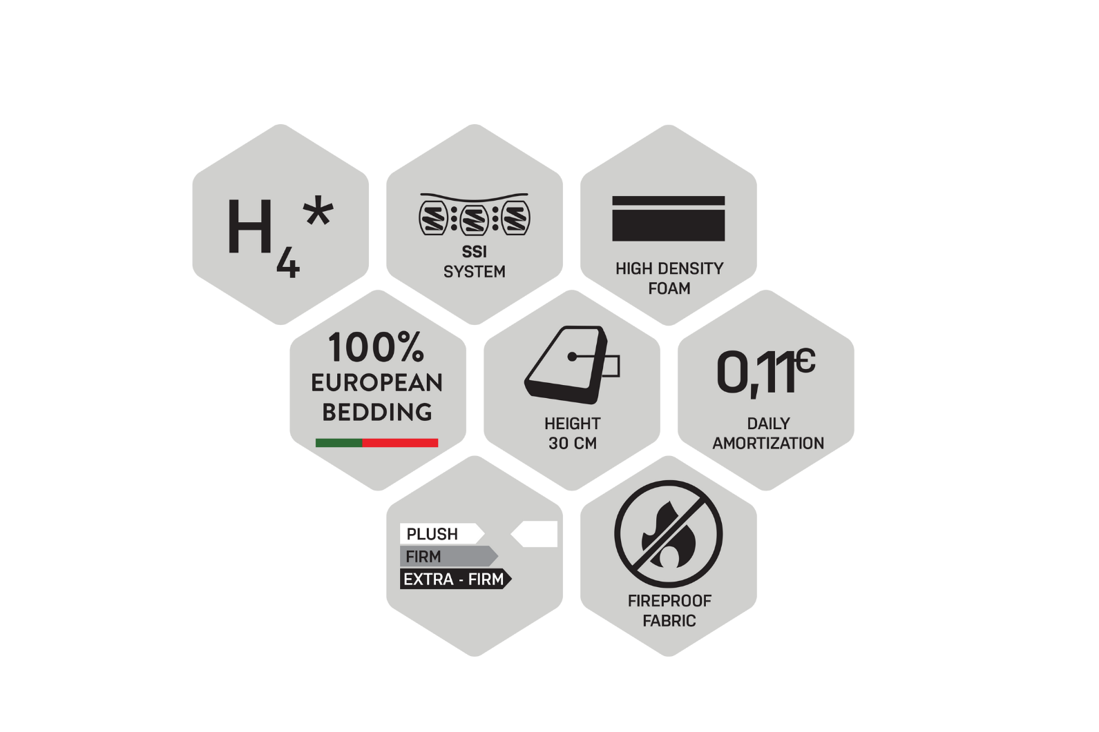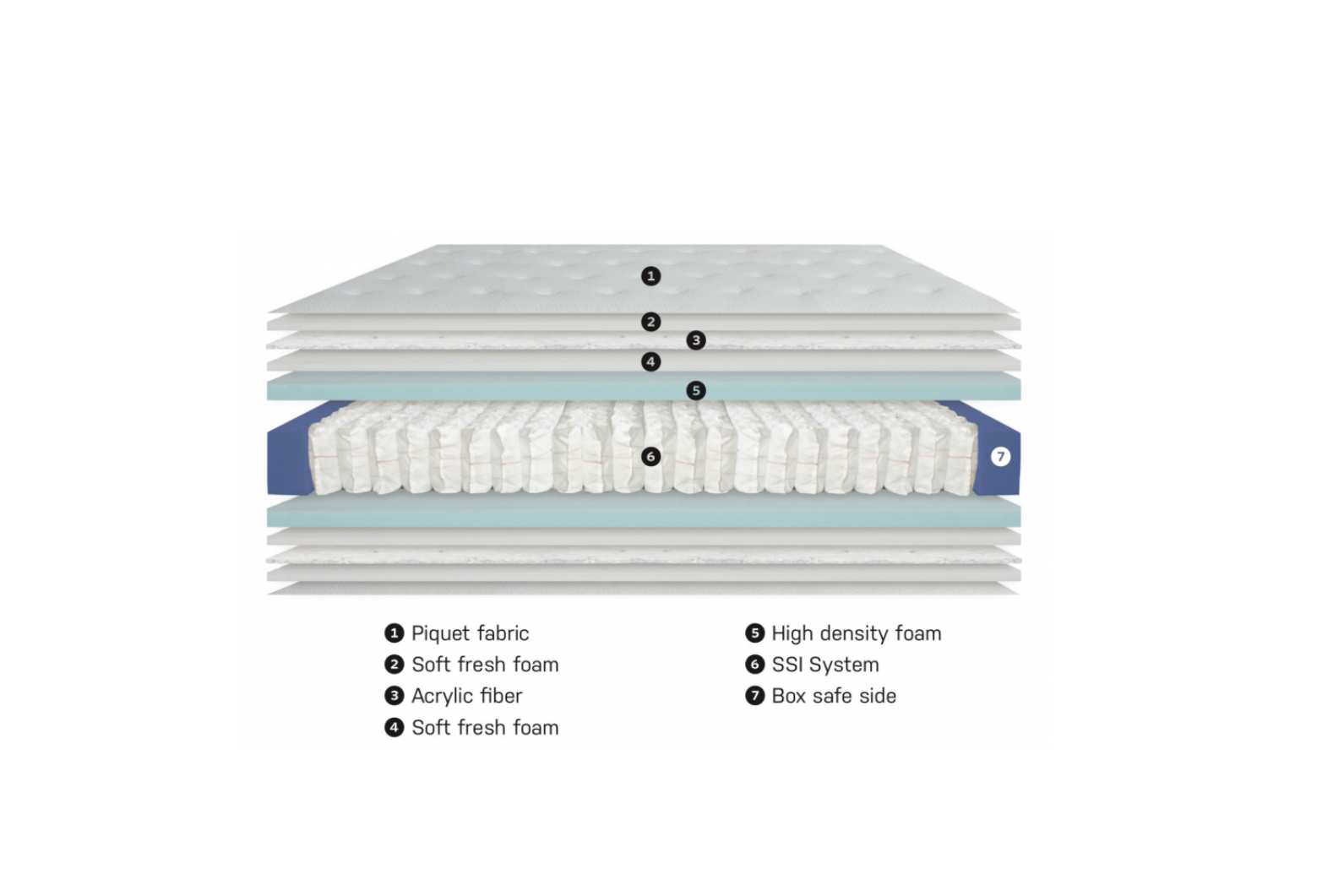 Sistema SSI, de molas ensacadas, de suspensão ponto por ponto. Totalmente independente. Permite a ventilação interna. Espumas adaptáveis e resistentes. Grau superior de conforto. Firmeza intermediária (estrutura). Sistema de Caixa de Segurança, que garante que toda a área de superfície seja útil.