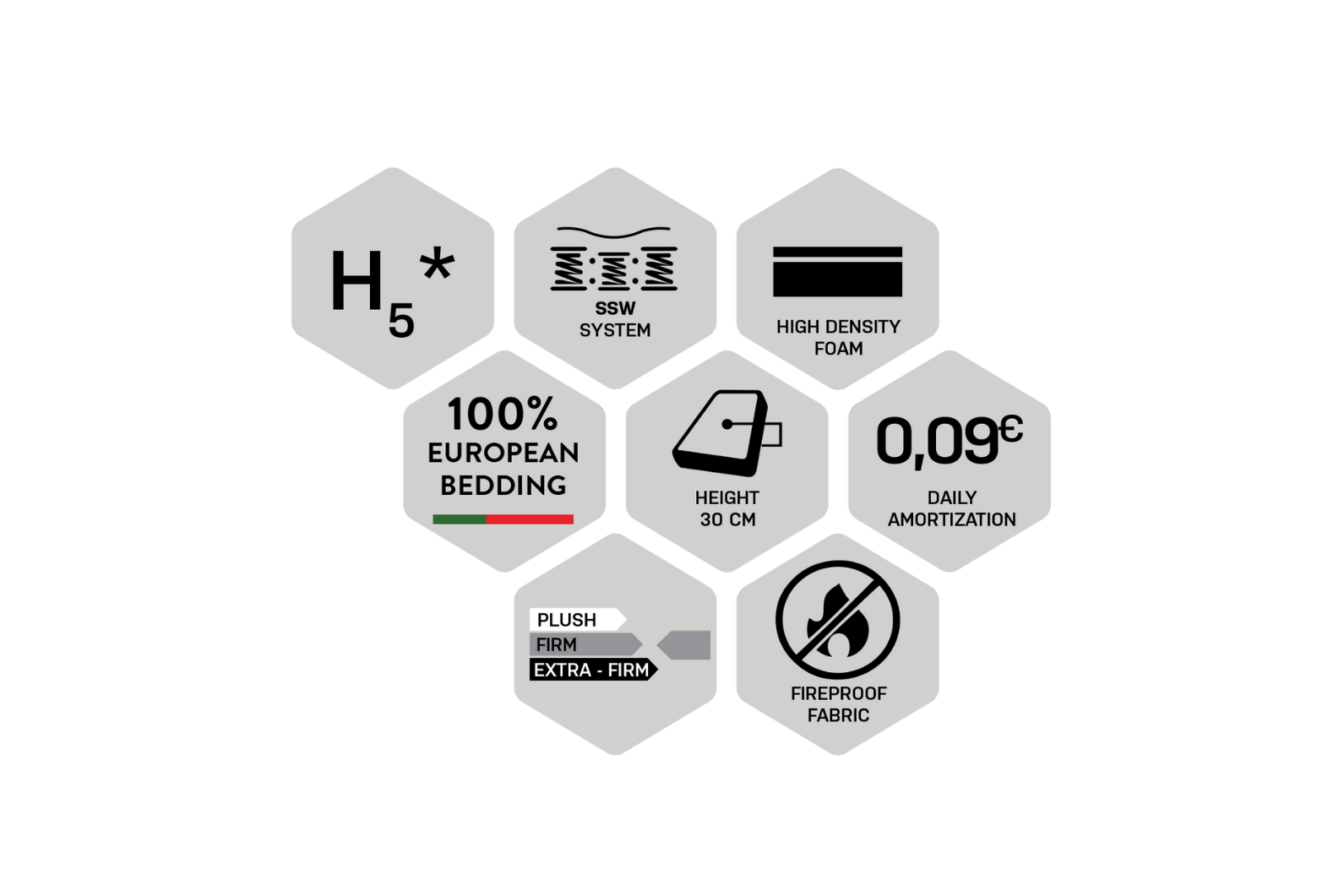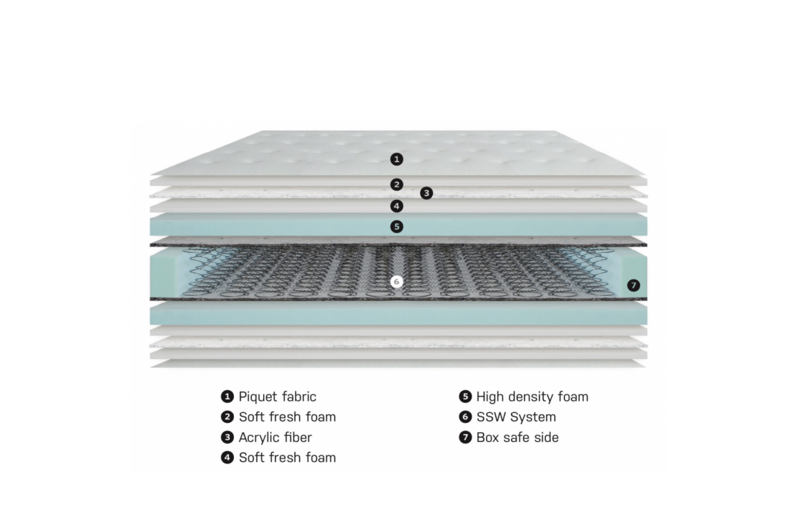 Sistema de suspensão que garante o melhor suporte e permite ventilação interna. Espumas adaptáveis e resistentes que permitem excelente adaptabilidade aos contornos do corpo. Alta firmeza (estrutura) com excelente adaptabilidade no topo. Sistema de Caixa de Segurança, garante que toda a área de superfície seja útil.