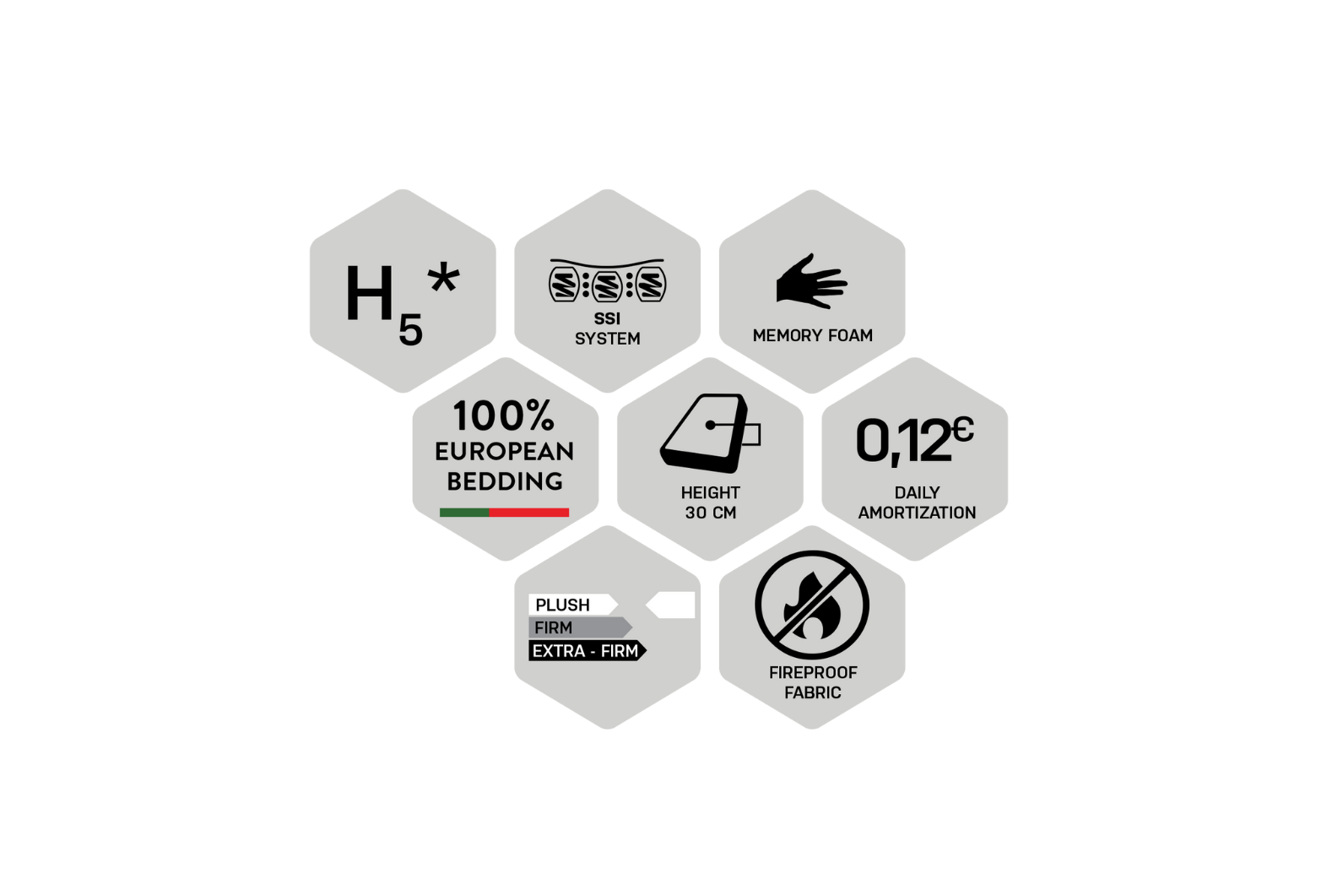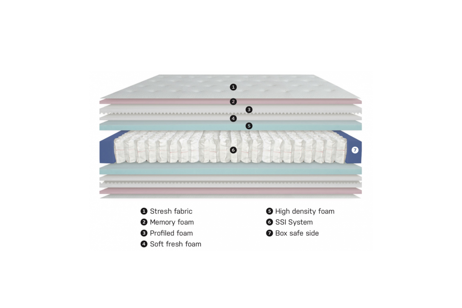 Sistema SSI, de molas ensacadas, de suspensão ponto por ponto. Totalmente independente. Permite a ventilação interna. O viscoelástico permite uma excelente adaptabilidade aos contornos o corpo, garantindo conforto máximo. Firmeza intermediária (estrutura). Sistema de caixa de segurança, que garante que toda a área de superfície seja útil.